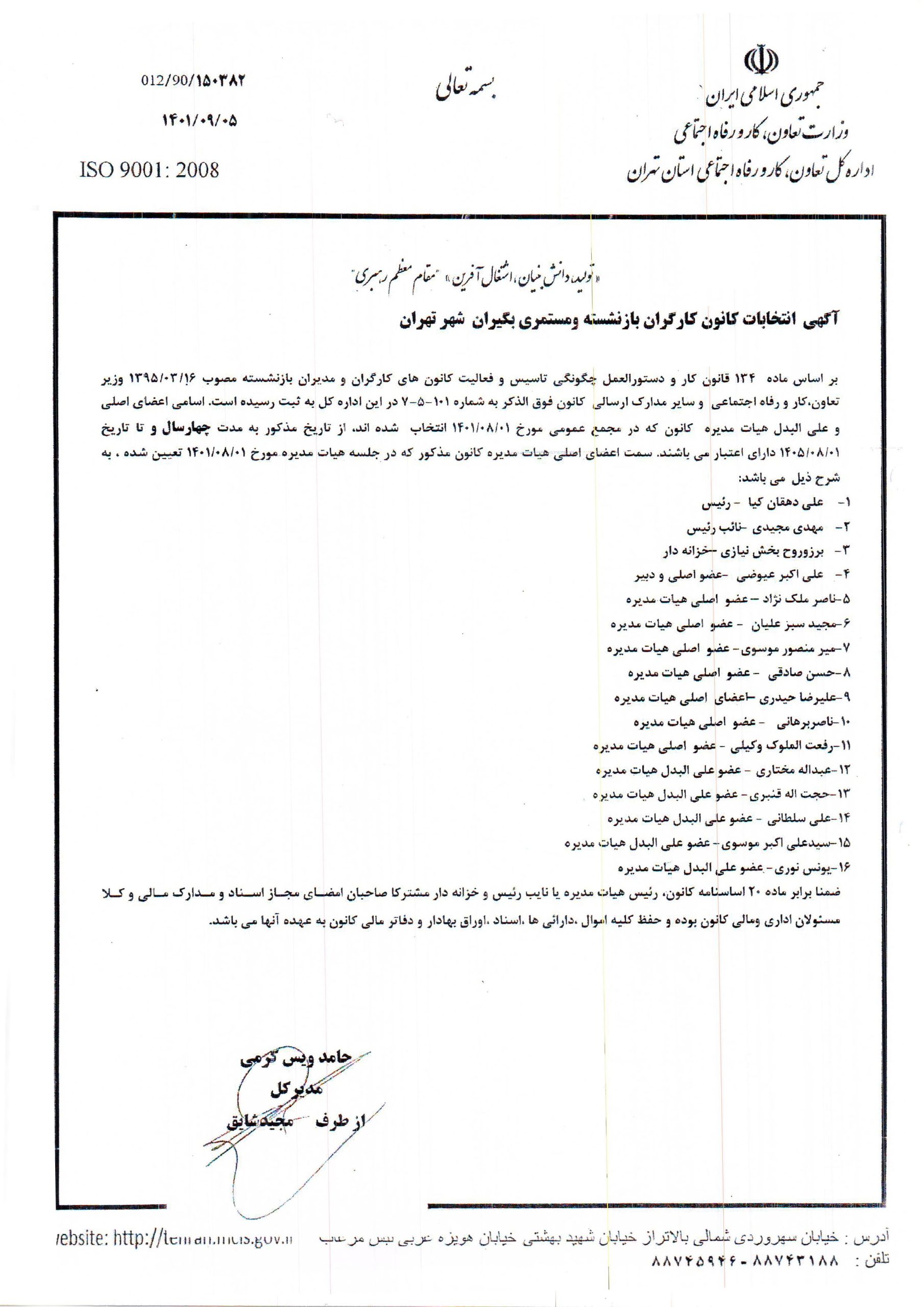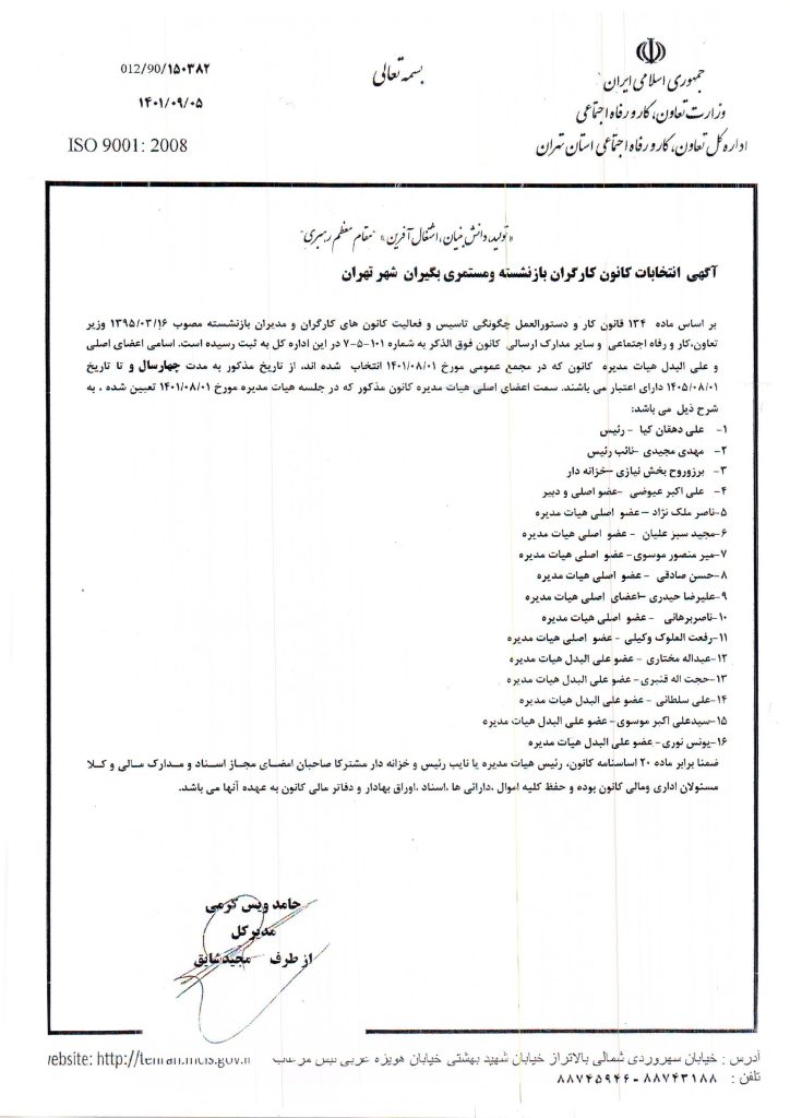 • بموجب ماده 134 قانون کار جمهوری اسلامی ایران باستناد صورتجلسه مورخ 1373/02/06 کانون کارگران بازنشسته شهرستان تهران در تاریخ 1373/04/27 به شماره 101 در اداره کل ثبت گردید.